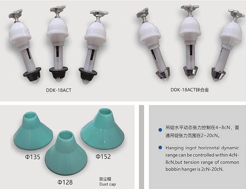 第二代自動恒定引紗張力吊錠(型號DDK-18ACT),解決了多年來在吊錠使用過程中存在的大、中、小粗紗退繞張力不一致問題,避免粗紗條易意外伸長、下墜,從而改善細(xì)紗出硬頭、成紗易出細(xì)節(jié)紗疵、粗紗條下墜易堵喇叭口以及因?yàn)榈蹂V引起的錠差過高等問題,明顯改善了各項(xiàng)成紗指標(biāo)。