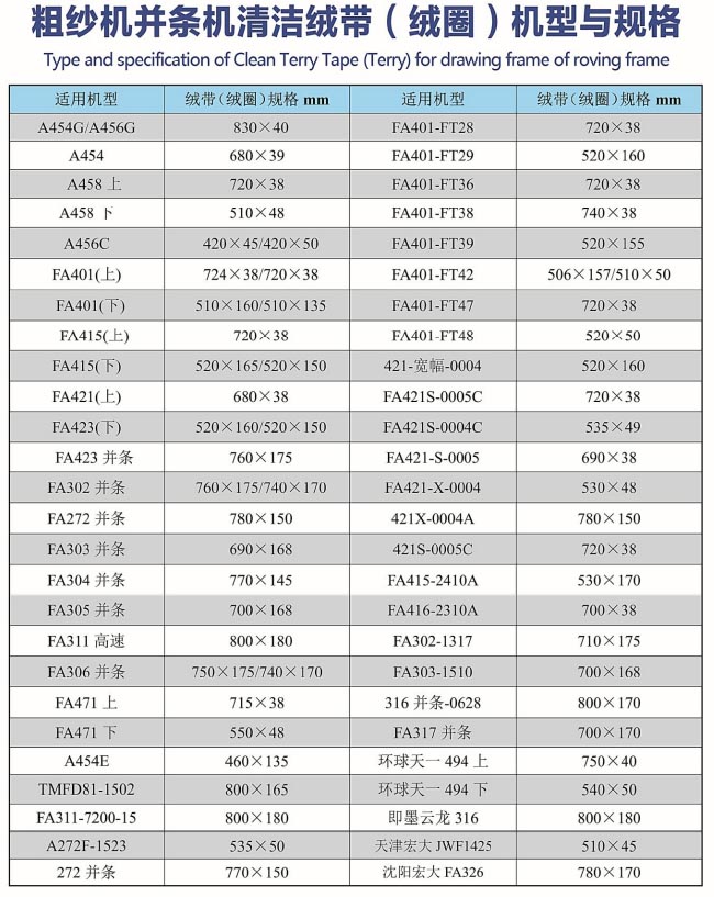 我公司降重推出第九代新型高科技納米材料,粗紗機、并條機清潔絨帶(絨),真正做到了無靜電、抗靜電、無熒光、永不拉長、四條絨帶在清潔器上運轉(zhuǎn)平穩(wěn)一致,而且不起棉結(jié)、清花效果比羊毛(白呢)和尼龍絨毛植絨帶提高了2倍,清花效果中有利的把附著在膠輥和羅拉上的短絨、飛花、雜質(zhì)清掉,使粗紗干條大大減少了游羽、圈羽現(xiàn)象,永不拉長節(jié)約了停機次數(shù),為粗紗車間每年節(jié)省用工17-21個工期,提高了效率,為紡織廠節(jié)省了開支。從前的絨帶全部有熒光,第九代絨帶真正做到了無熒光,在現(xiàn)代紡紗中,提倡紗線的綠色健康熒光實際就是化工化學產(chǎn)品而造成的,我們采用意大利進口白棕樹棕毛,經(jīng)過12道工序制作當前絨化,又開發(fā)了先進的植絨機器,讓絨毛和底布結(jié)合的更牢固,如果絨帶上有熒光,就造成了絨帶和羅毛,拉摩擦產(chǎn)生靜電、起棉結(jié)現(xiàn)象,棉結(jié)落到粗紗干上,造成了很大的瑕疵,還有棉紗上有熒光,大大影響了染色有瑕疵、有異纖。新型高科技納米材料絨帶,它降低紗疵、提高成紗質(zhì)量,從而達到******高立,提高產(chǎn)品******化。